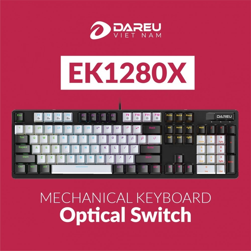 Bàn phím DareU EK1280X là mẫu bàn phím cơ full-size (104 phím) nổi bật với công nghệ switch quang học bền bỉ và khả năng kháng nước tuyệt đối, phù hợp cho cả game thủ và môi trường phòng net.