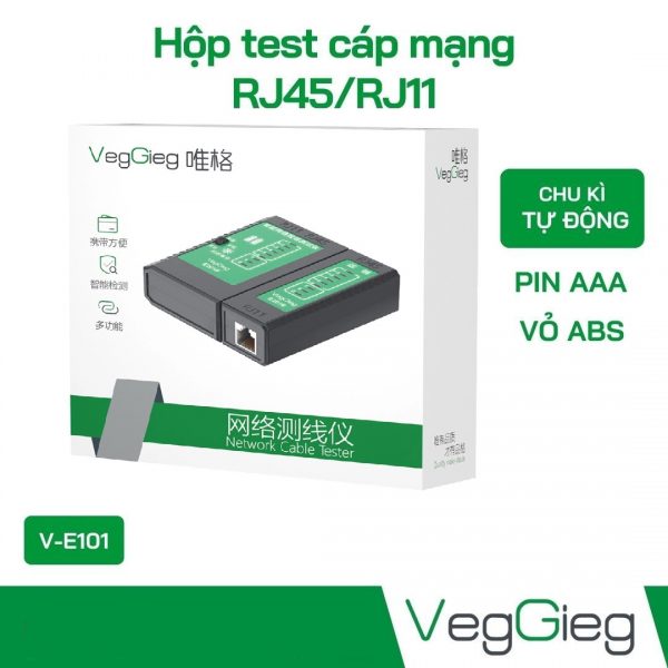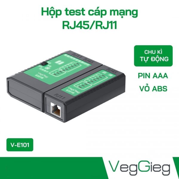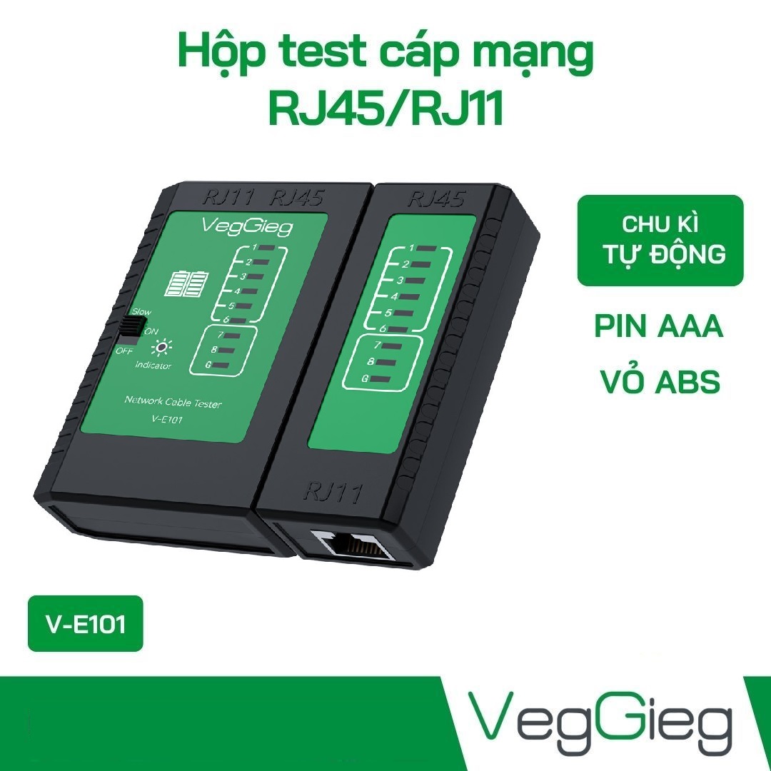 Hộp Test mạng VegGieg V-E101 là thiết bị chuyên dụng để kiểm tra đầu bấm mạng LAN và điện thoại, tương thích với các đầu bấm RJ45 và RJ11. Sản phẩm này dễ dàng sử dụng và giúp bạn nhận biết liệu đầu dây có được bấm đúng theo cặp hay không.