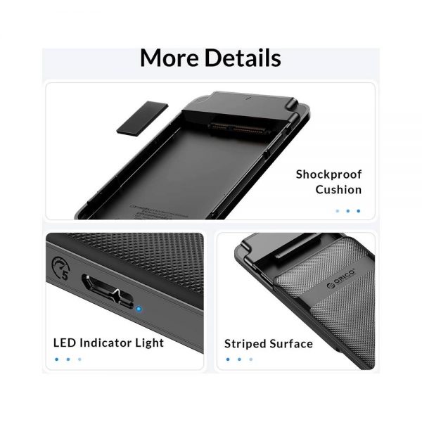– Thiết kế độc quyền: Free Enclosure từ Orico Mount Drive giúp tháo ráp trong 3 giây mà không cần công cụ và ốc vít – Super Speed USB 3.0: cho tốc độ lên đến 5Gbps, nhanh hơn 10 lần USB2.0 – Đổi mới thiết kế với chất liệu nhựa ABS vân carbon để cải thiện độ chống trượt và tính linh hoạt – Hỗ trợ ổ cứng HDD và SSD 7-9.5mm Fit Slim 2,5 inch SATA – Plug and Play, không cần nguồn phụ, Adapter hoặc Driver |