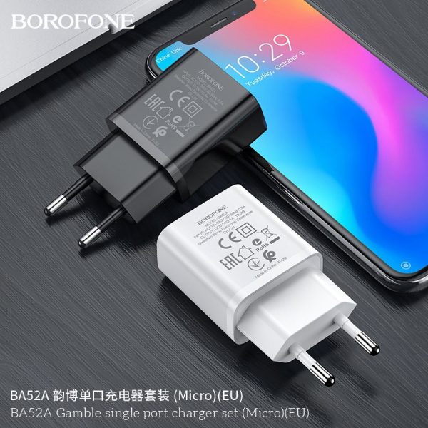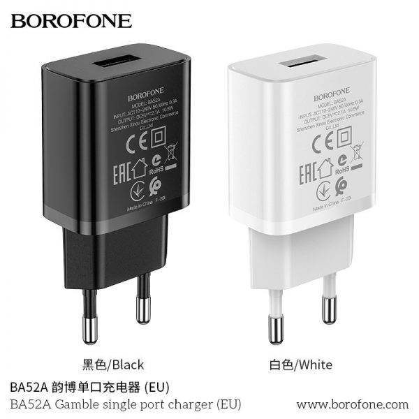 Cóc Sạc Borofone BA52A Cổng USB 2.1A chuẩn EU là một sản phẩm của nhà sản xuất phụ kiện uy tín Borofone, cung cấp cho người dùng công cụ sạc tiện ích và hữu dụng. Cốc sạc được thiết kế nhỏ gọn với kích thước 77*32*23mm, cân nặng 51g, phần chân sạc được thiết kế tròn giúp dễ dàng, giảm diện tích cắm vào ổ cắm điện. Với kích thước gọn nhẹ như vậy, cốc sạc vô cùng thích hợp cho những ai thường xuyên phải di chuyển nhiều. Những cốc sạc chỉ cần 2 chấu sạc để cắm vào ổ điện, tương tự như các cốc sạc một cổng khác.