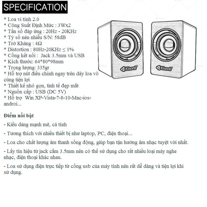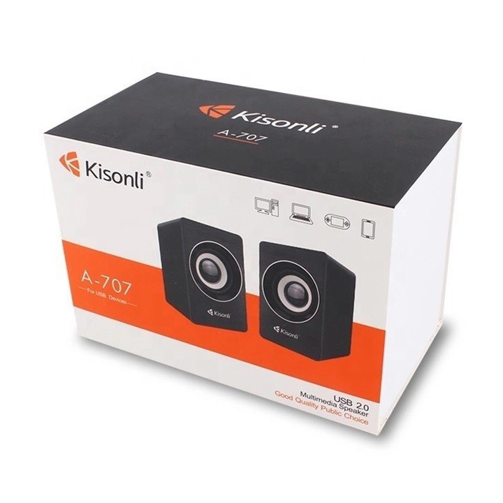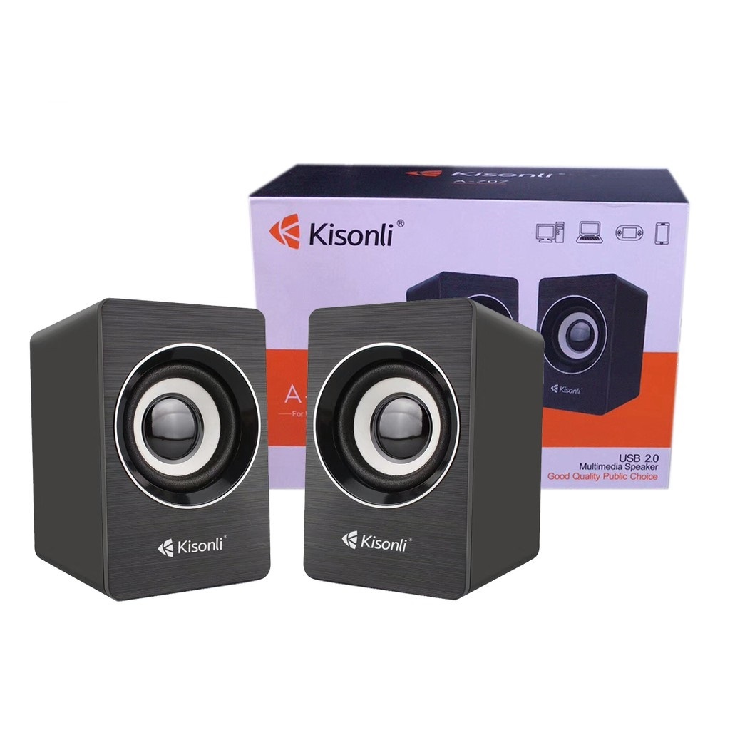 Loa Vi Tính 2.0Kisonli Model A707 Có Nút Chỉnh Âm Lượng Nguồn USB Điểm nổi bật – Kiểu dáng mạnhmẽ, cá tính – Tương thích với nhiều thiết bị như laptop, PC, điện thoại… -Loa cho chất lượng âm thanh sống động, giúp bạn tận hưởng âm nhạc tuyệt vời. -Lấy tín hiệu từ jack cắm 3.5mm nên có thể sử dụng cho rất nhiều loại máy nghenhạc, điện thoại khác nhau. – Loa sử dụng điện trực tiếp từ cổng usb của máytính nên rất dễ dàng và tiện lợi khi sử dụng.
