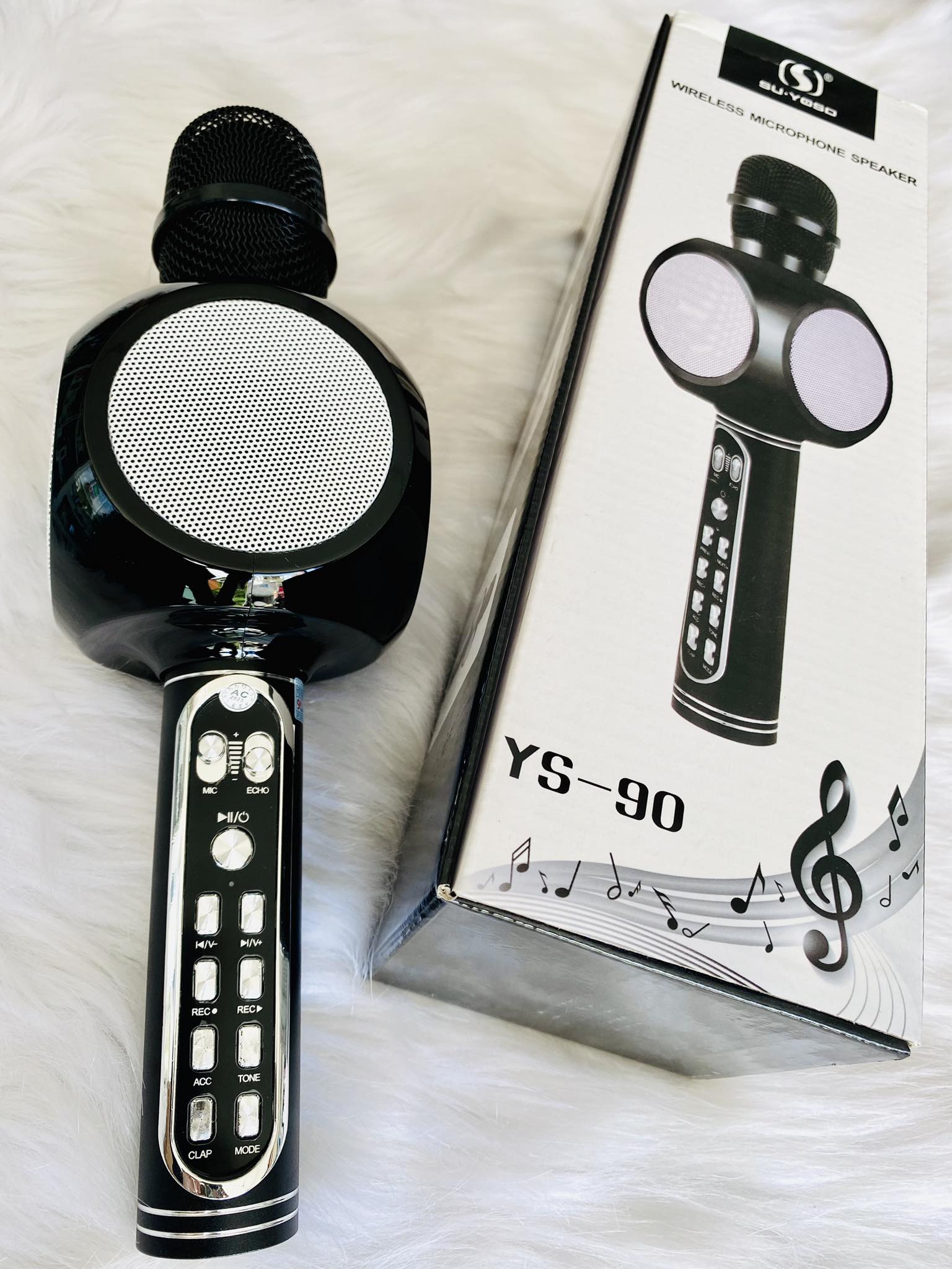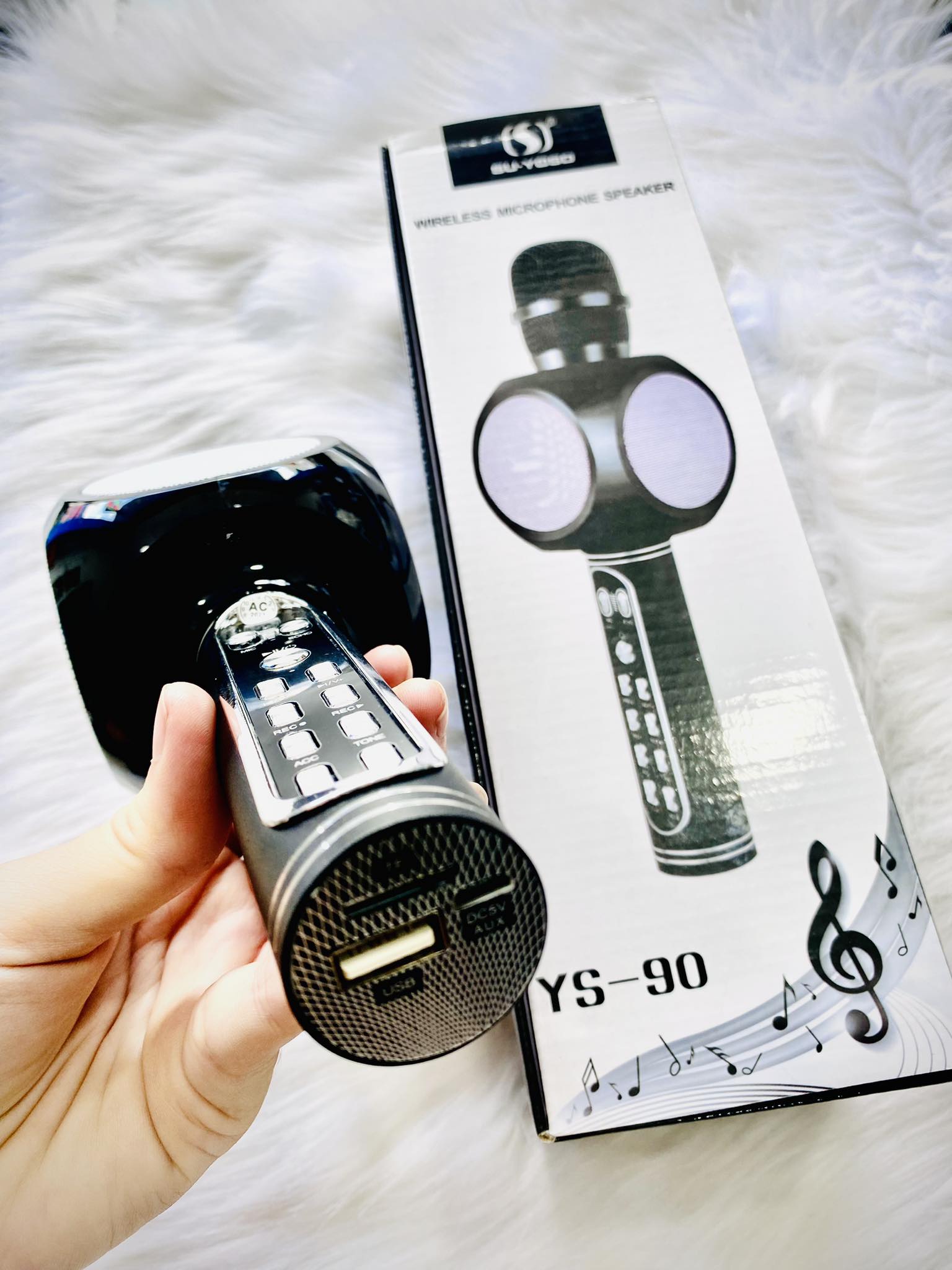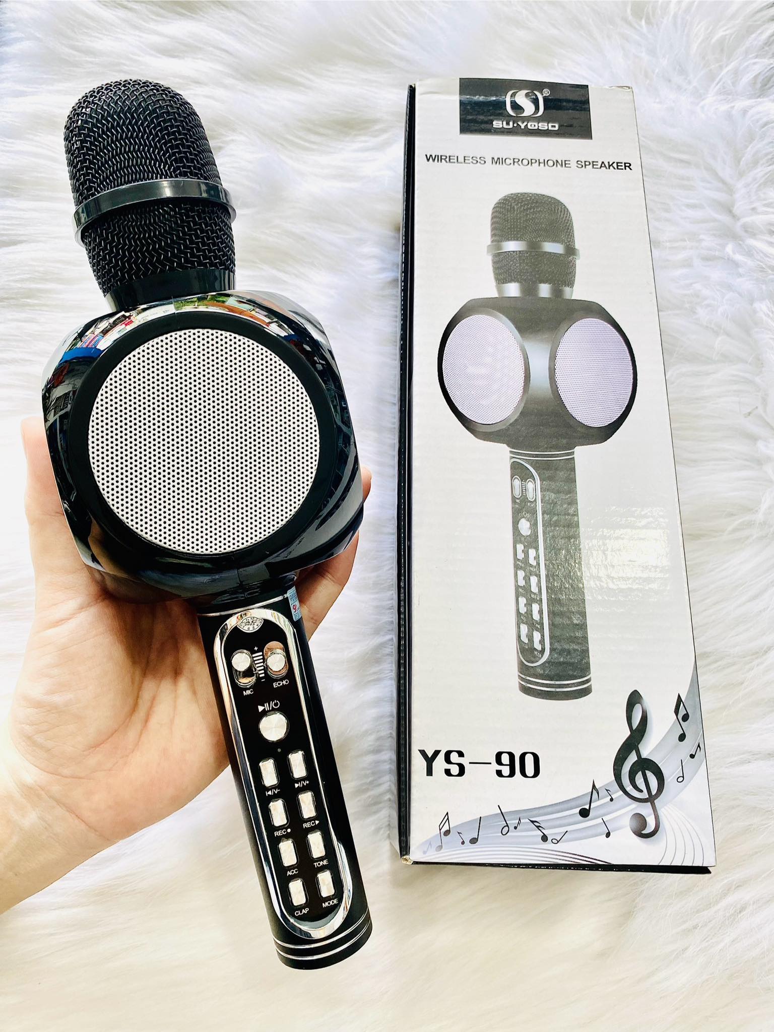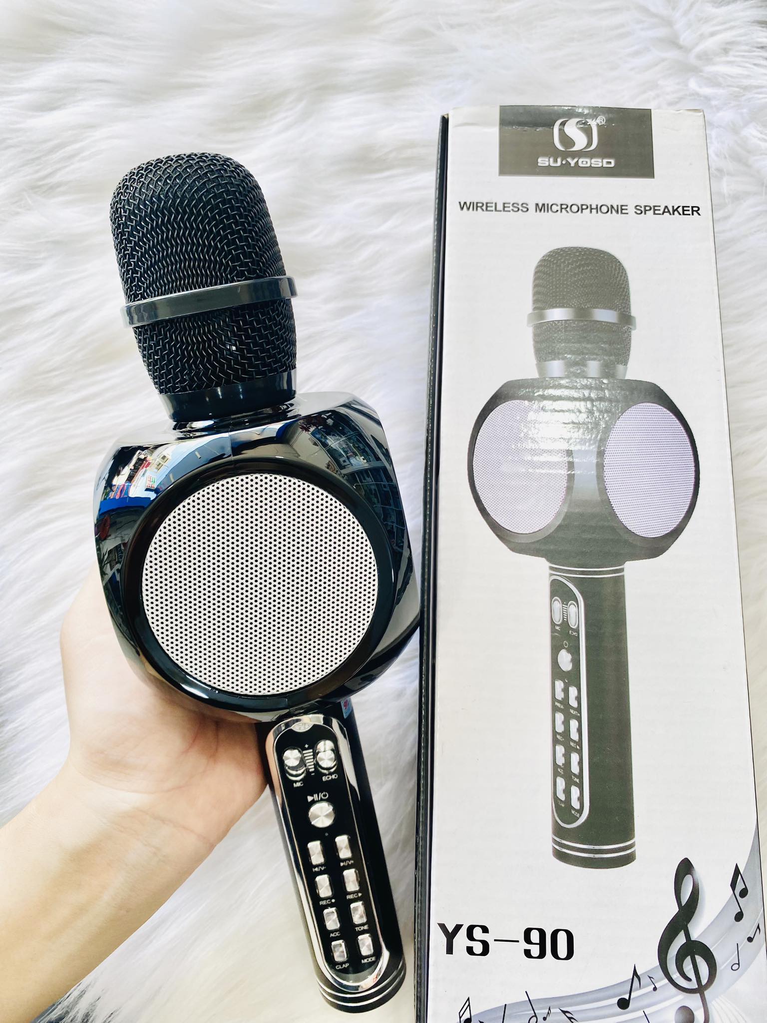 - Micro Karaoke Bluetooth YS91 khắc phục được nhược điểm là tiếng loa bị rè, vỡ âm hay loa đột nhiên rú lên khi vô tình ma sát vào vòm mic. Các nút điều chỉnh chức năng được sắp xếp hợp lý thuận tiện sử dụng hơn khá nhiều.