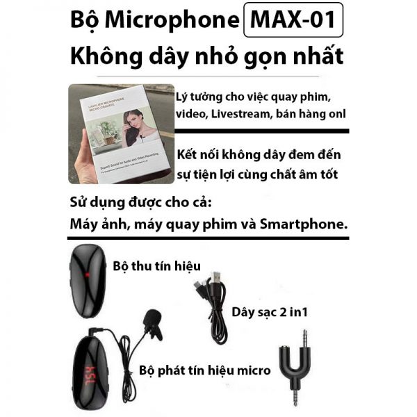 Micro thu âm cài áo đa năng bluetooth Max 01 – Dành cho Điện Thoại, Máy Ảnh DSLR, Máy Quay – Hỗ trợ livestream, trợ giảng, thuyết trình chuyên nghiệp
