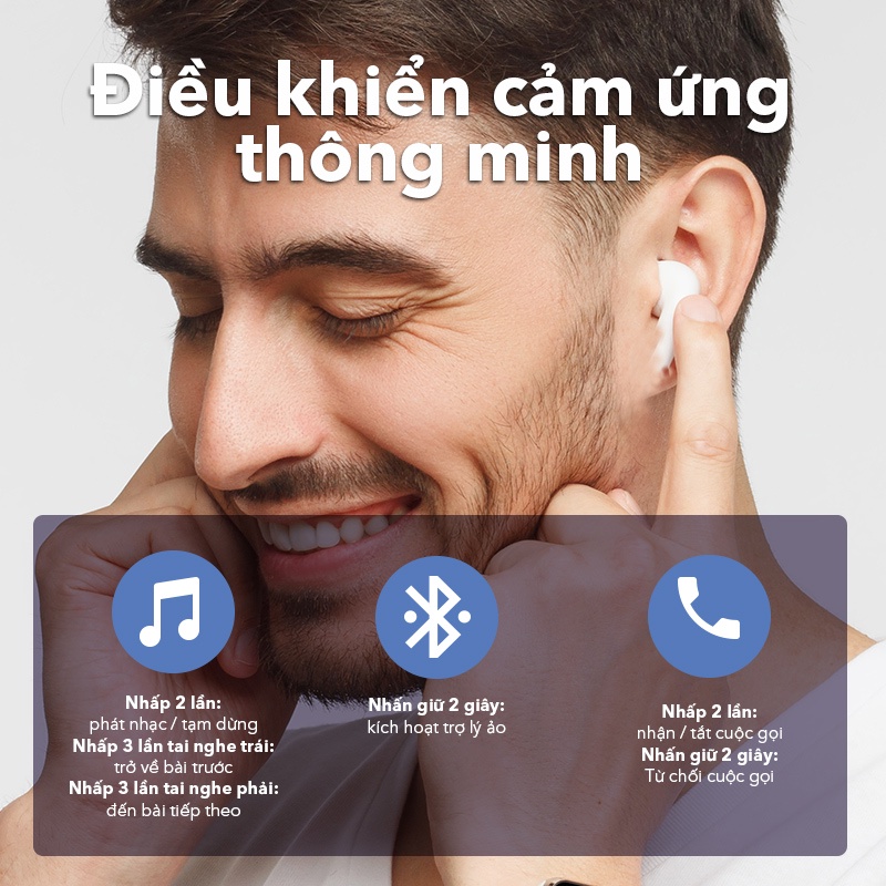 🔵Điều khiển cảm ứng thông minh: + Nhấp 2 lần: phát nhạc/tạm dừng + Nhấp 3 lần tai nghe trái: trở về bài trước + Nhấp 3 lần tai nghe phải: đến bài tiếp theo Nhấn giữ 2 giây: kích hoạt trợ lí ảo Cuộc gọi: Nhấp 2 lần; Nhận/ Tắt cuộc gọi Nhấn giữ 2s: từ chối cuộc gọi