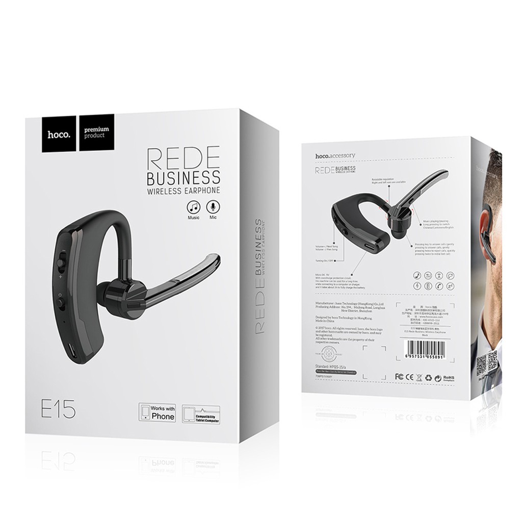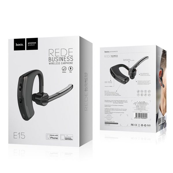 -Tai nghe HOCO E15 Wireless được hãng phụ kiện hoco mang hơi hướng tai nghe cao cấp của dòng tai plantronics mang đến sự sang trọng, đẳng cấp. Thiết kế móc vành tai giúp chắc chắn, hoạt động thoại mái không lo rơi.