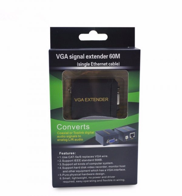 BỘ TRUYỀN 60M VGA EXTENDER cho phép làm cầu nối giúp kéo dài tín hiệu VGA lên đến 60m bằng Cáp mạng LAN sử dụng để kéo dài. Quý khách muốn sử dụng dây Vga dài 60m, nhưng thị trường không có dây hoặc mua về nối vào thì không hiện lên hình ảnh vì dây quá dài nên đường truyền yếu rồi mất tín hiệu. thì đây Bộ VGA EXTENDER sẽ khuếch đại rồi đẩy tín hiệu Vga đi xa đến 60m.